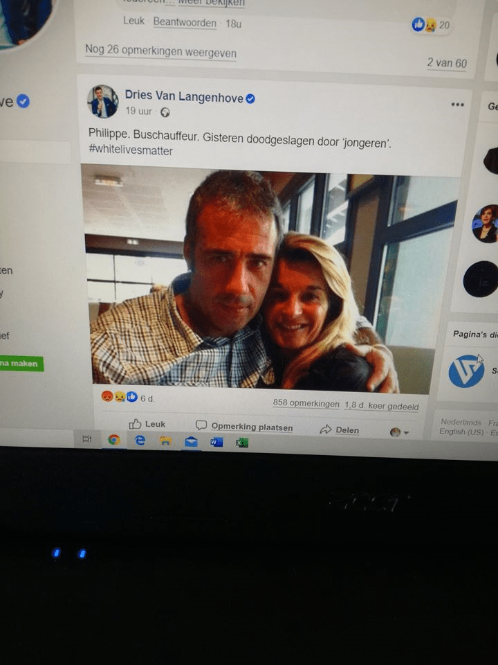 Dan toch maar eens gaan kijken op DVL zijn FB-pagina en zie en lees daar het volgende : “Philippe, Buschauffeur. Gisteren doodgeslagen door ‘jongeren’ #whitelivesmatter.” En een foto van de buschauffeur met zijn partner. Maar…géén enkele link naar het artikel in HLN. (zie eerder)