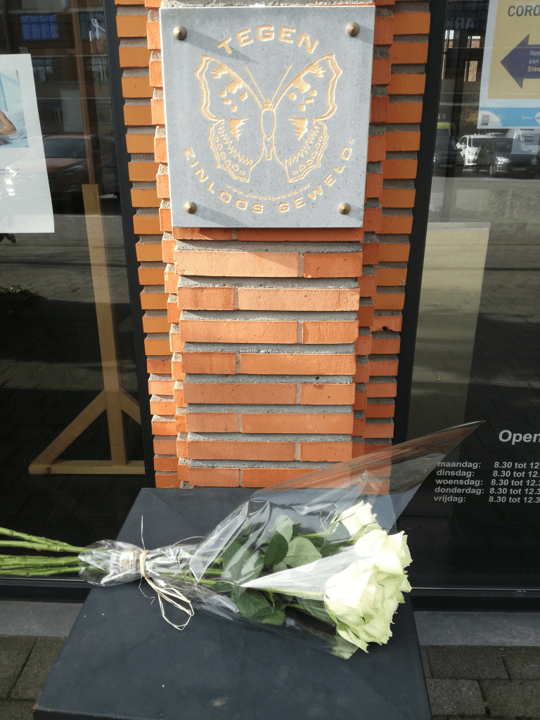Ik heb om 11.00u deze ochtend, witte rozen neergelegd aan de tegel tegen zinloos geweld, aan de ingang van het stadskantoor Turnhout.