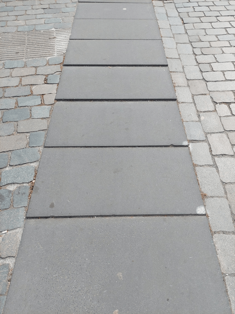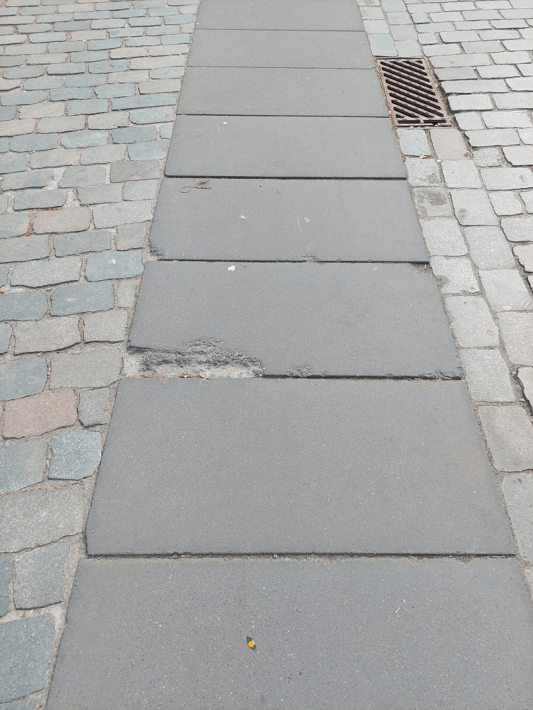 Zoals het looppad aan de westkant van de markt. Stukken en brokken en alles behalve evenwijdig… menigeen stootte hieraan al wel eens één of meer tenen.