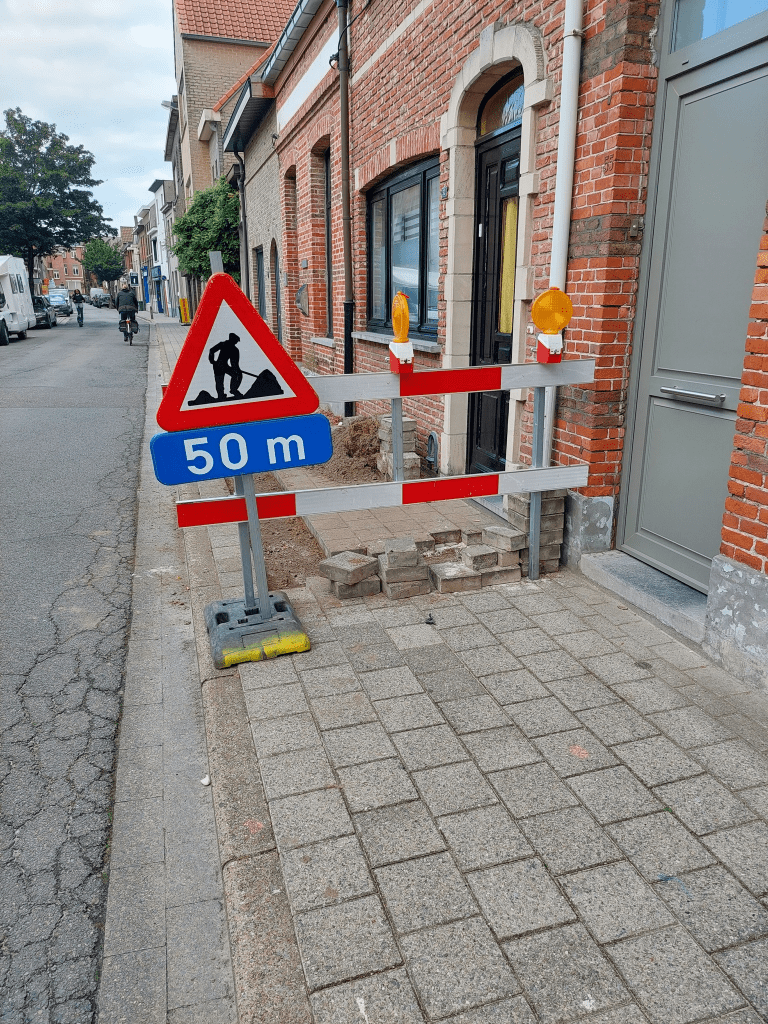 TIP voor de dienst mobiliteit : ervoor te zorgen dat dan bij het begin van de straat waar deze bouwwerf is, een verkeersbord(je) te plaatsen dat voetgangers daar al de straat oversteken. Het zou nuttig zijn dat zowel de dienst mobiliteit als ruimtelijke ordening afspreken, om elke week eens langs te gaan bij dergelijke bouwwerven om na te gaan of de nodige signalisatie wel is aangebracht…liefst te voet of met de fiets