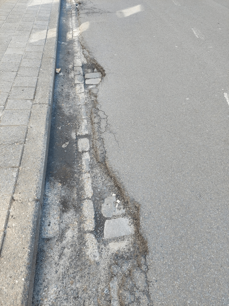 Door steeds maar weer de ene asfaltlaag op de andere aan te brengen werden langs de rand van de fietsstrook in de Koning Albertstraat, erg diepe en gevaarlijke putten gevormd rond de rioolputjes..Ook in de Begijnenstraat kan je dit fenomeen terugvinden