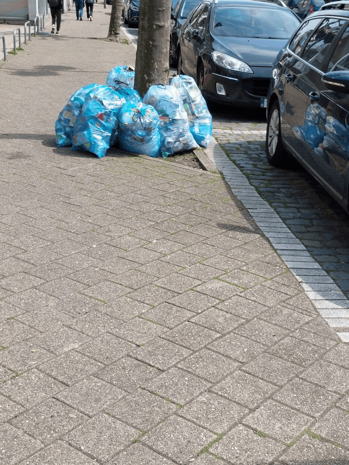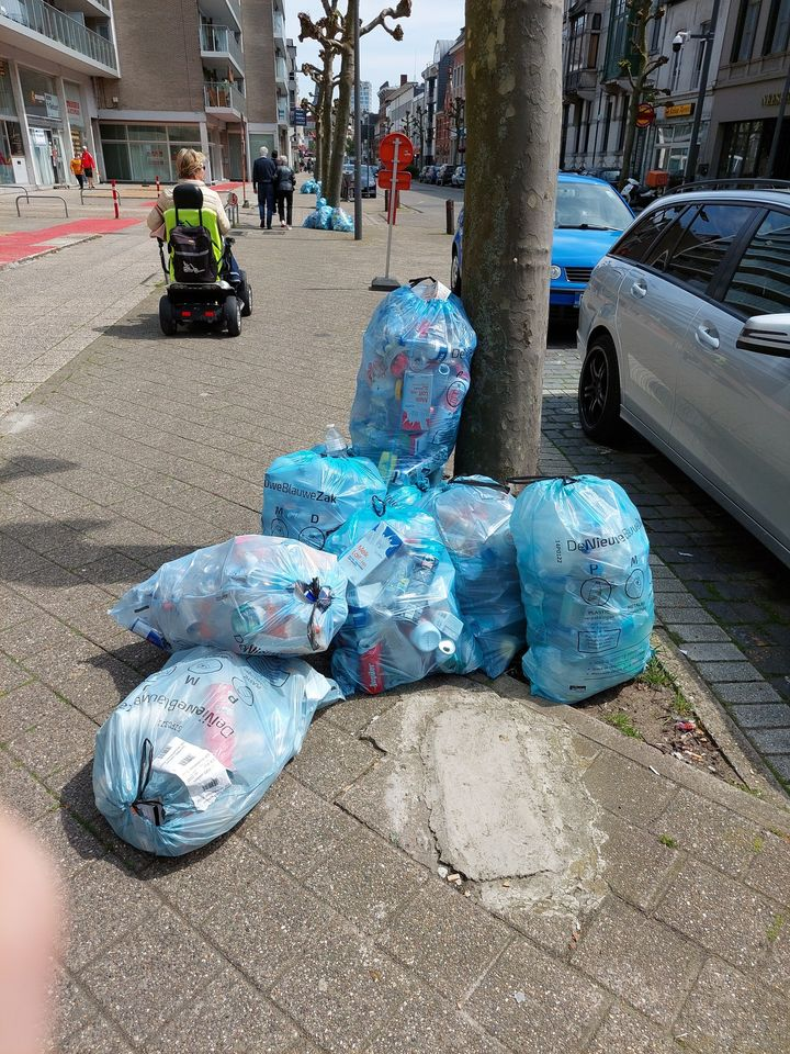 En dan stuitten we al snel op een De Merodelei waar het krioelt van de blauwe PMB-zakken… Een dag te vroeg buiten gezet, ongetwijfeld omdat velen de Afvalkalender niet- of niet begrijpend hebben gelezen. Trouwens ook in andere straten zie je vele blauwe zakken opduiken…
