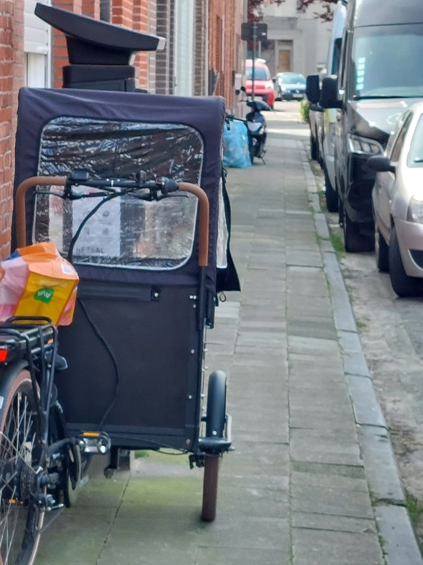 De situatie zoals op de foto, doet zich op meerdere plaatsen voor. Wat de locatie van deze foto betreft : enkele meter verder is er een stedelijke parkeerplaats. Het is misschien te overwegen om op zo een stedelijke parking een veilige en droge parkeerplaats te creëren voor dergelijke bakfietsen ? Maar vooral moeten naar de nabije toekomst toe, de stoepen breder worden gemaakt !!