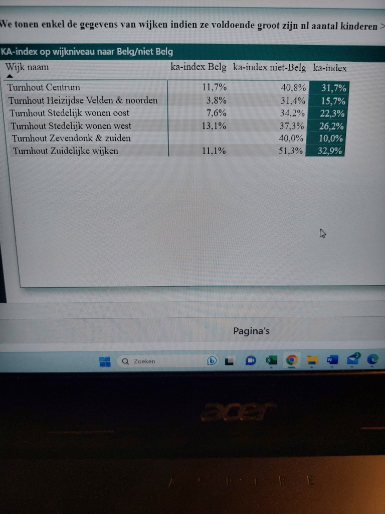 Zo is de algemene kansarmoedeindex in Turnhout 26,8%. Maar wat geboortes betreft bij een moeder van Belgische herkomst is de index 9,9% Bij geboortes bij een niet-Belgische moeder stijgt die index naar 39% of maar liefst 4 keer hoger.