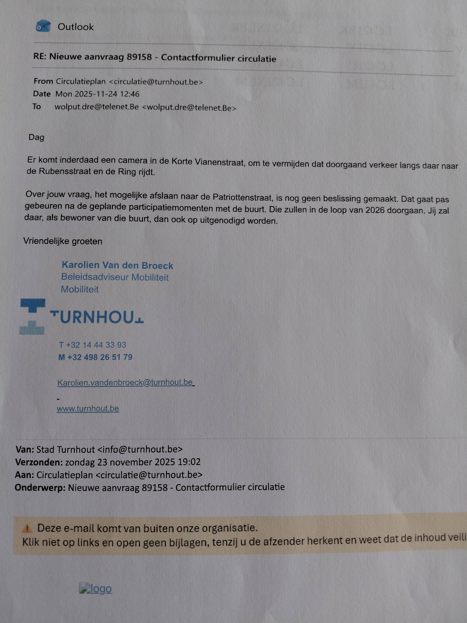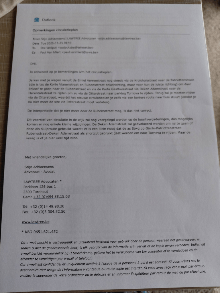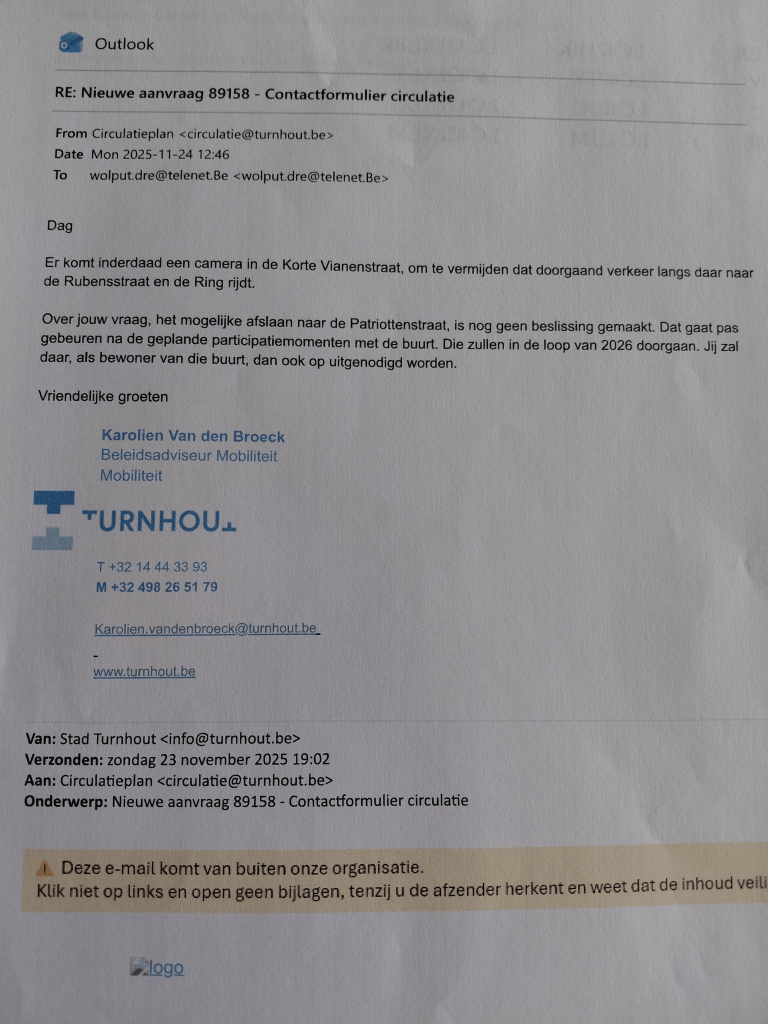 *Momenteel mogen we met de auto via de Patriottenstraat nog wel links naar de Rubensstraat om zo via de Deken Adamsstraat naar de Turnovaparking te rijden. Of, als we geluk hebben kunnen we ook op één van de parkings voor mindervaliden terecht. Of dit in de toekomst ook nog zal mogen ? Daar kreeg ik ook géén sluitend antwoord op. Want dit voorstel zal nog worden voorgelegd op de buurtvergaderingen en de Deken Adamsstraat zal nog worden geëvalueerd op mogelijk sluipverkeer (zie antwoord van schepen Stijn Adriaensens)
