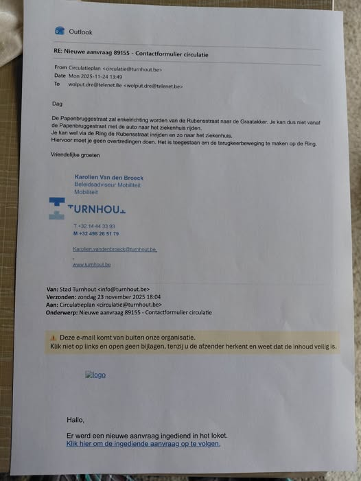 *Hoe ik in de toekomst naar het ziekenhuis (Campus Sint-Elisabeth) kan ? Via de Papenbruggestraat en of linksomkeren aan het kruispunt Graatakker dan géén verkeersovertreding zou zijn. Antwoord van de dienst zegt dat Papenbruggestraat enkelrichting zal worden en linksomkeren op de ring géén verkeersovertreding is (zie antwoord mobiliteit)