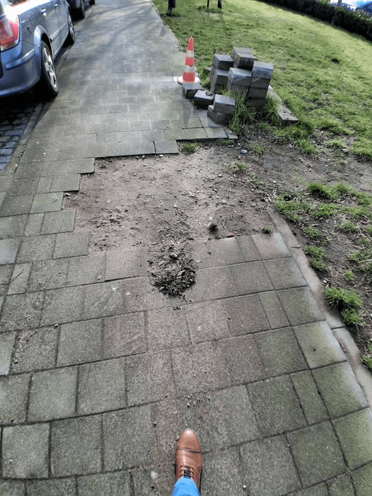 Zo werd maanden geleden -ergens in 2024- een stuk van de stoep langs de Vlamingenstraat opgebroken om aansluitingen mogelijk te maken voor enkele nieuwe laadpalen op de parking Loechtenberg.